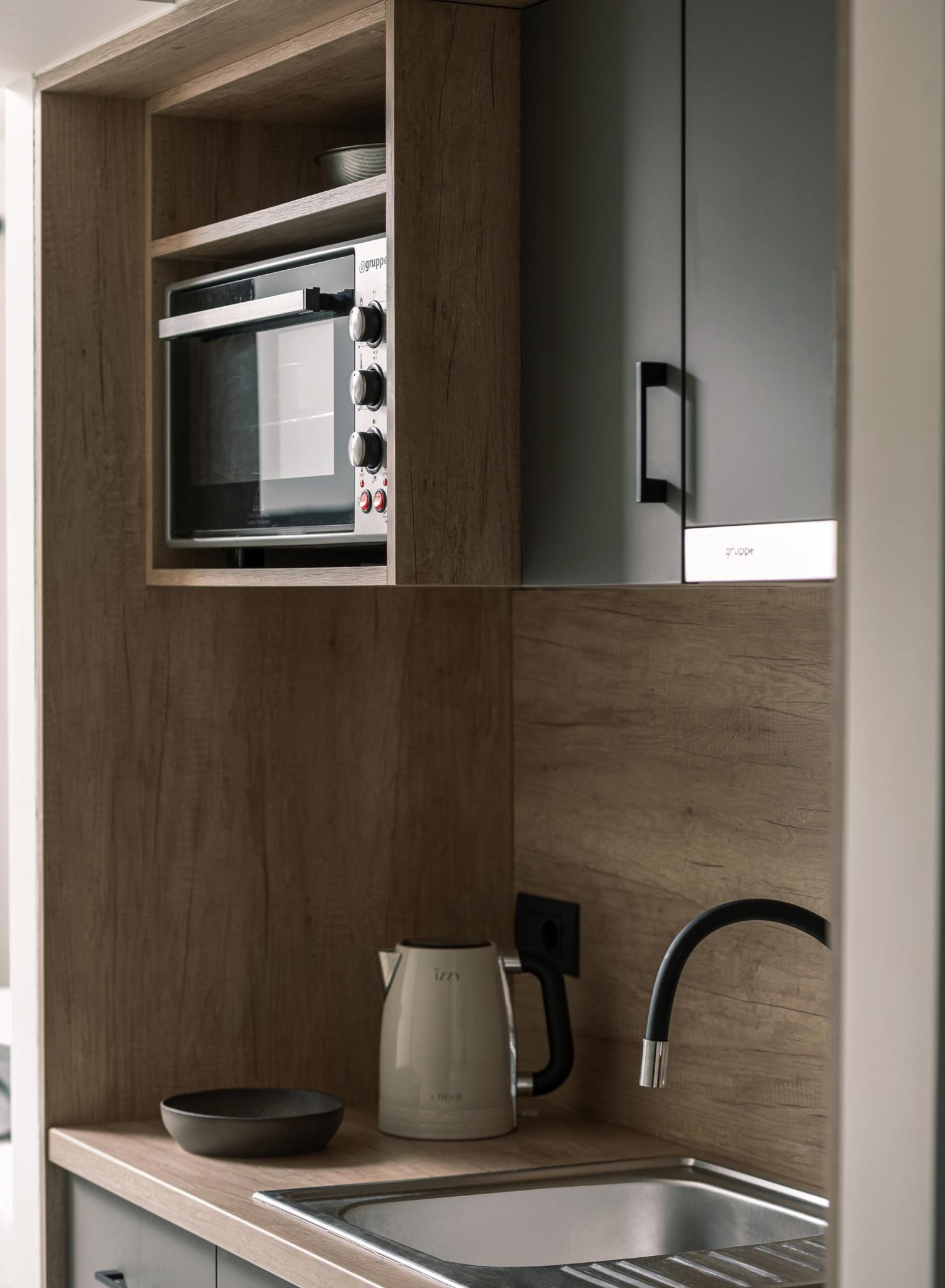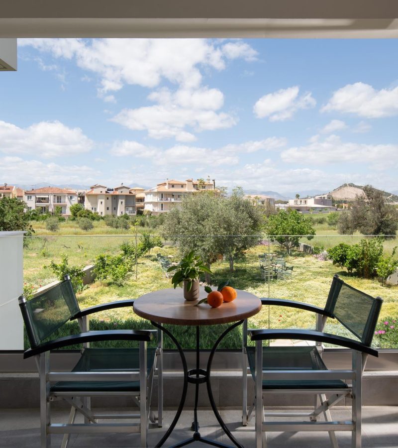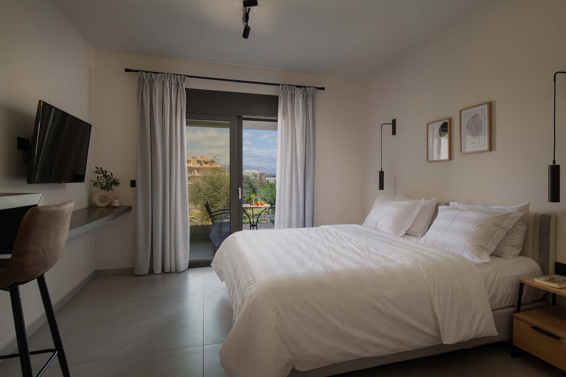 Relax in style as you make yourself at home in a room designed for your every comfort. Our spacious, air-conditioned room offers a king-size bed, a flat-screen TV for entertainment, and a charming terrace to unwind. The fully-equipped kitchenette, complete with a stovetop, oven refrigerator, kitchenware, and a tea and coffee maker, awaits your culinary adventures. Step into the en-suite bathroom, stocked with complimentary personal care organic products, by Greek company Pandrosia. Experience a peaceful night’s sleep on the natural coco-mat mattress with a choice of pillows ensuring a well-rested stay. Savor the panoramic garden and Palamidi fortress views from the balcony seating area.
