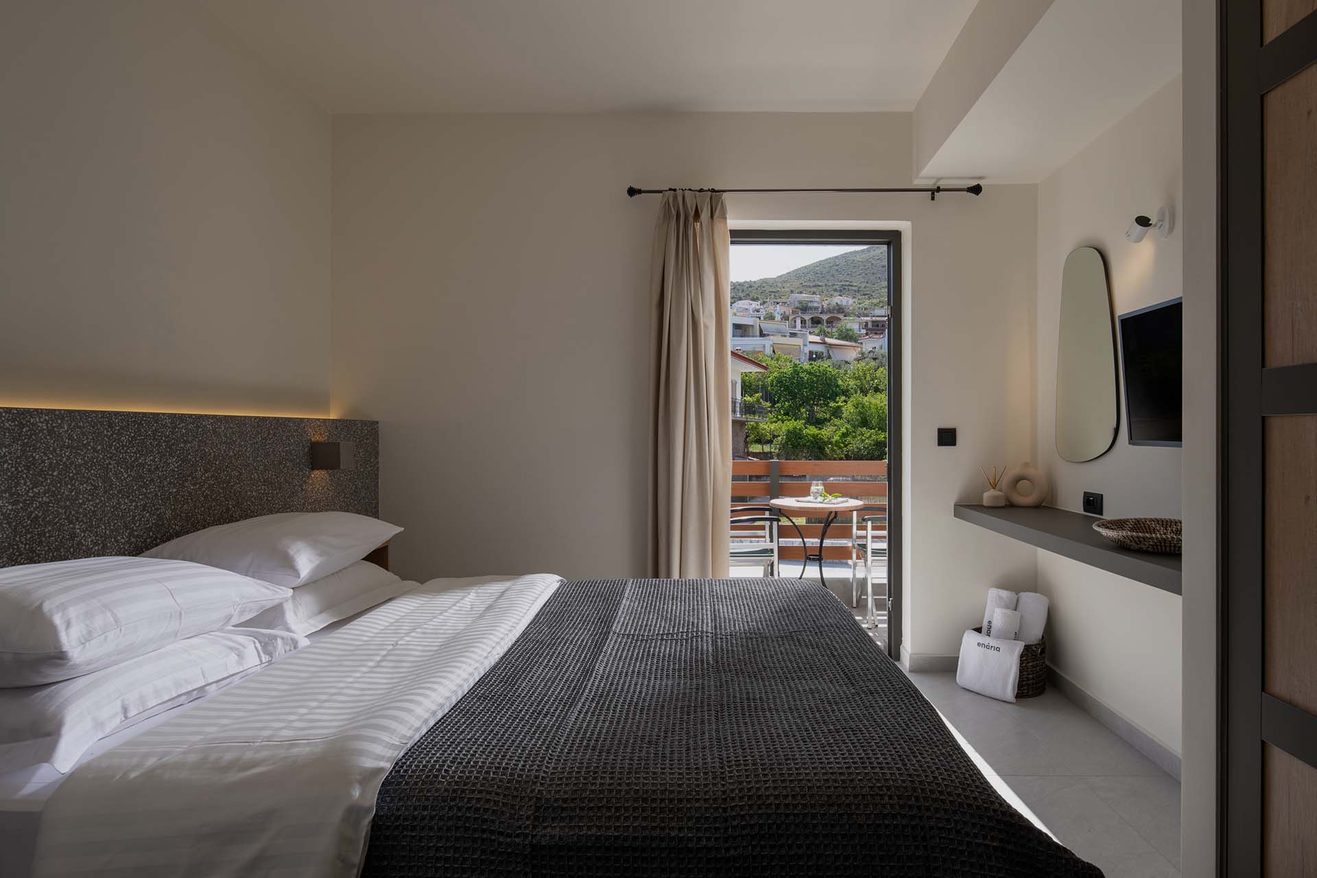 Welcome to our delightful apartment, featuring a charming living room, a separate inviting bedroom, and a modern bathroom. The fully-equipped kitchenette with an oven, a stovetop, a refrigerator, and all the kitchenware you need, ensures a convenient stay in Nafplio. Experience the true comfort of our air-conditioned space, complete with a flat-screen TV, a plush sofa, a dining table for four, and a convenient tea and coffee maker for a relaxing getaway. You’ll love the coziness of the queen-size bed, furnished with our luxurious coco-mat mattress and a choice of pillows to ensure a peaceful night’s sleep. The bathroom is stocked with complimentary personal care products of the Greek company Pandrosia from certified organic Greek raw materials. After a restful night, relax in the comfortable balcony seating area and soak in the picturesque garden and Palamidi fortress views.